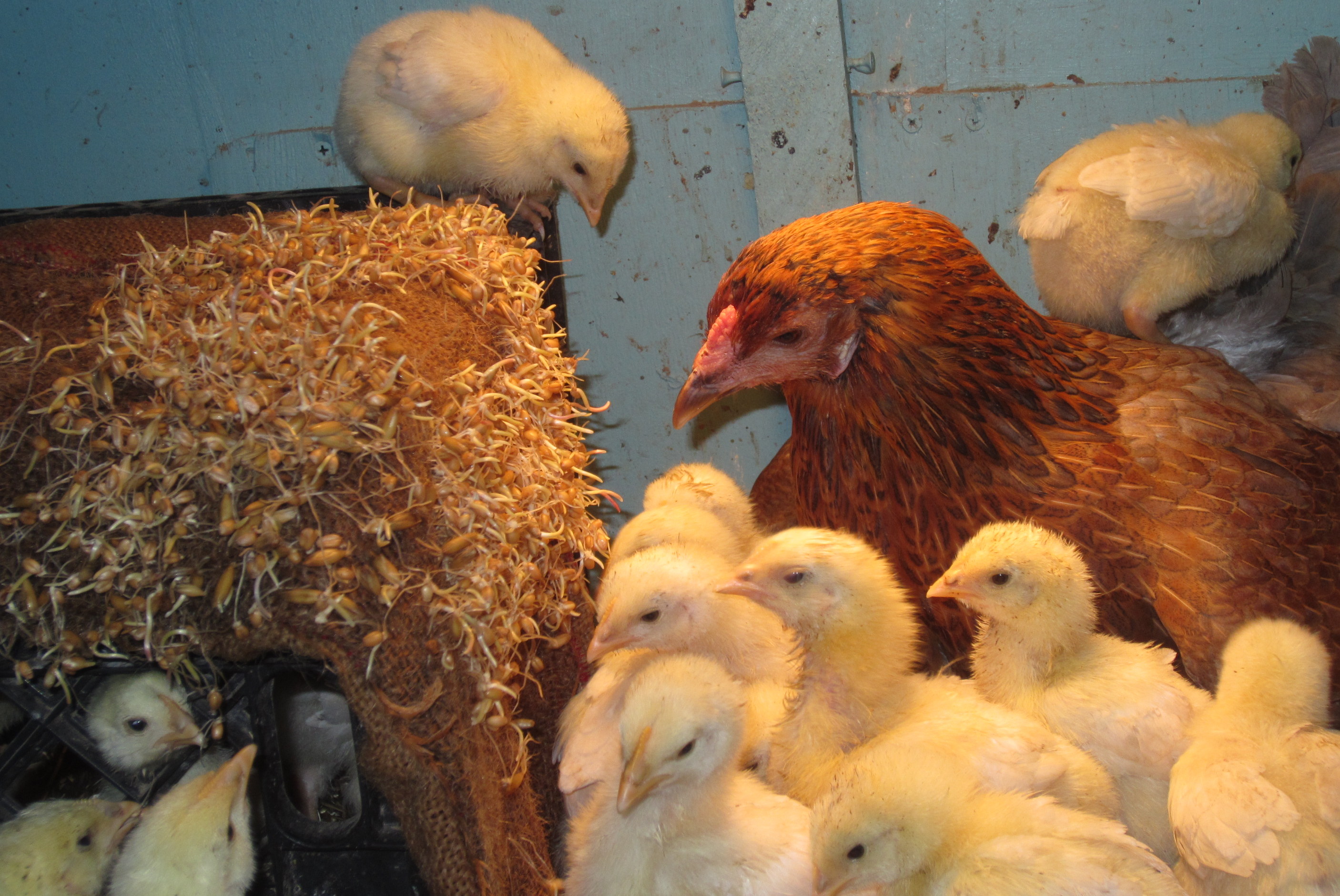 "Lydia" wouldn't allow "Olive" to come out of her "milk crate", so I partially separated them, giving Olive all the Cornish meaties. She fully accepted them, but became so protective of them, that she ended up killing several of Lydia's chicks that came too close. But, she did a wonderful job of teaching those lazy Cornish how to be more active and be more like "regular" chickens. Here's one of my favorite pictures of Olive and her brood, teaching them how to eat sprouted whole grains: