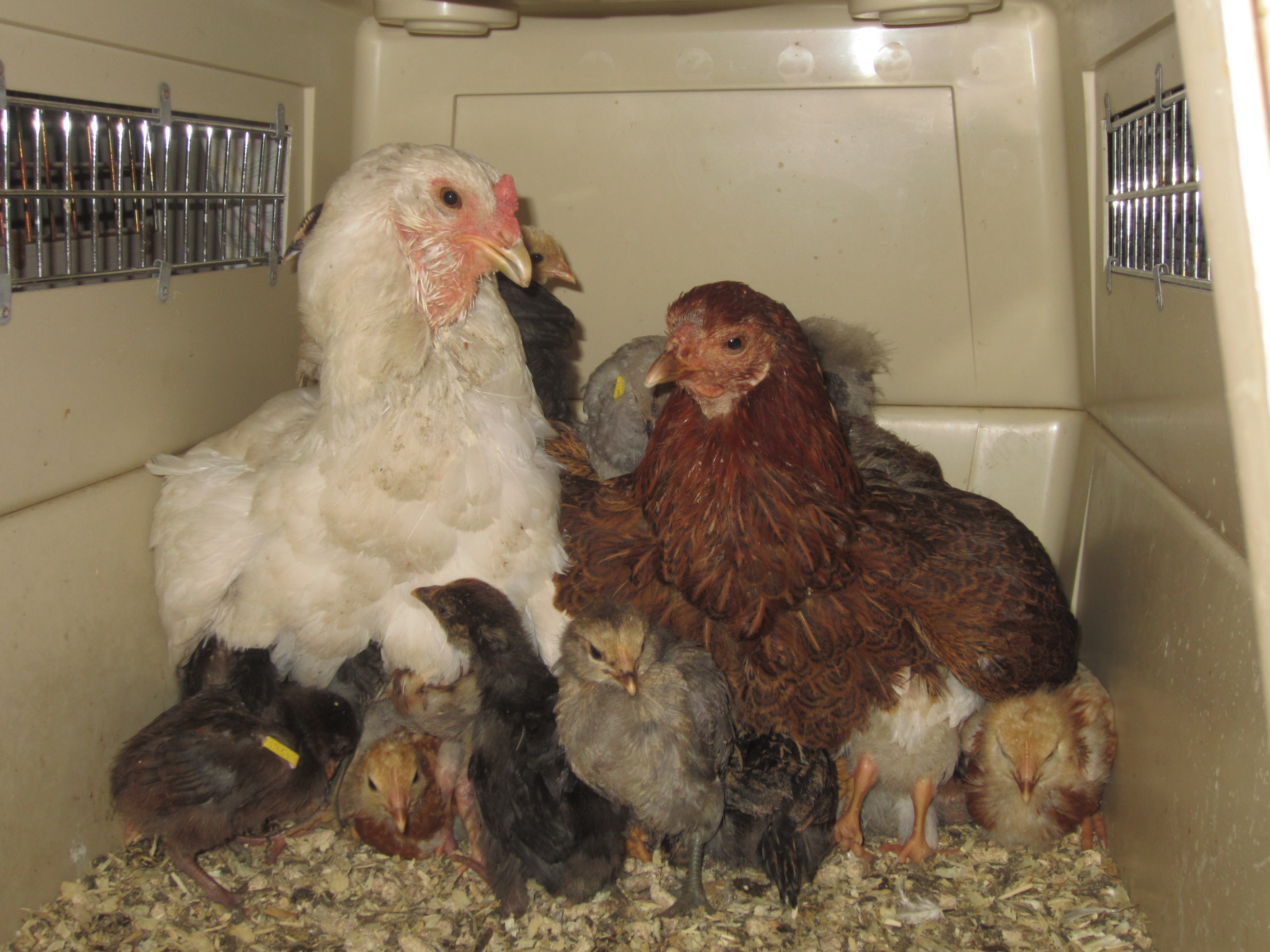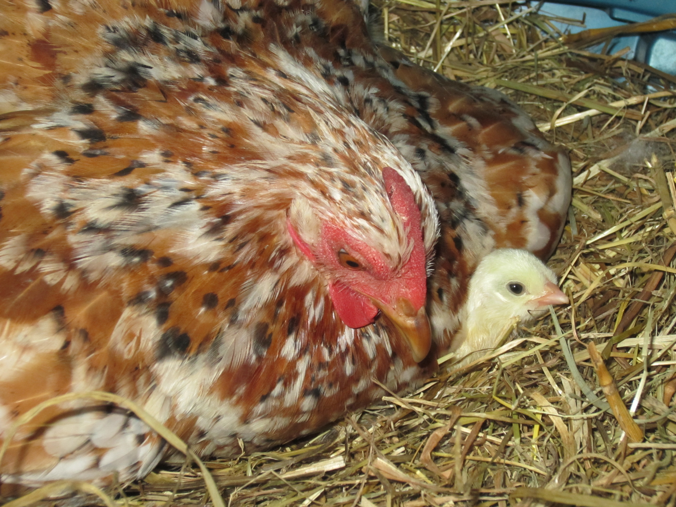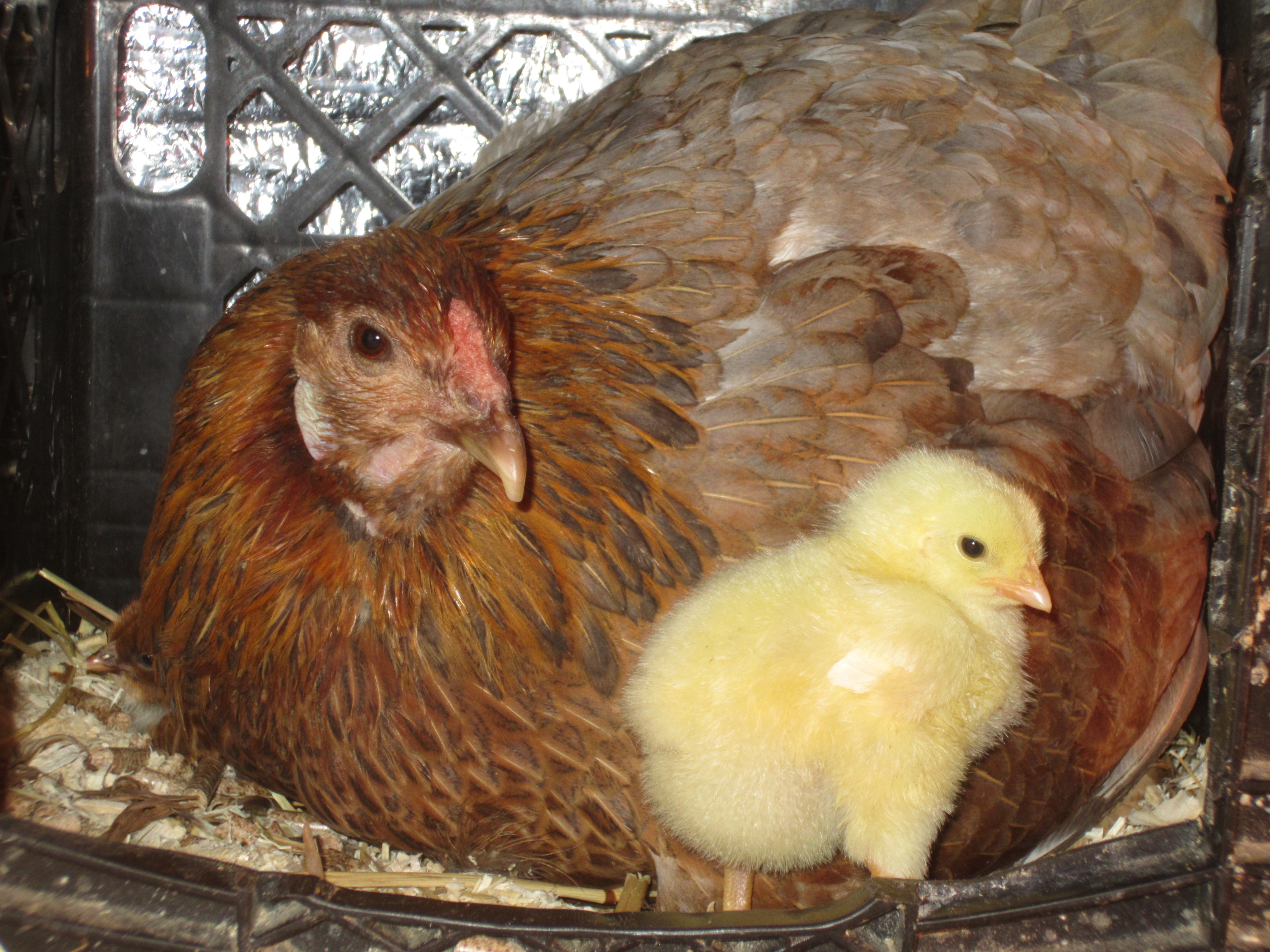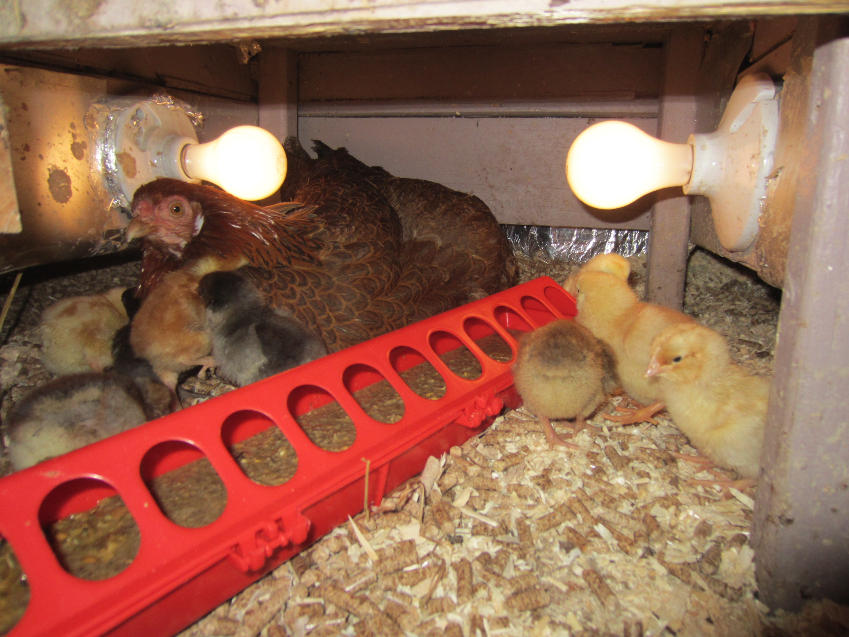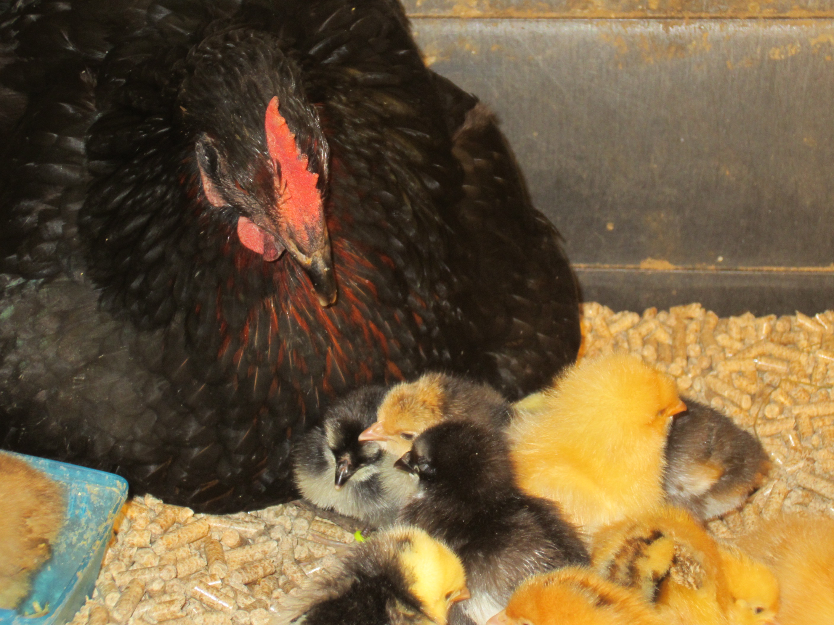 In 2014, another hen, "Olive" hatched out chicks in the nesting box. Then I moved her into a separate coop with her mother "Lydia" (Partridge Chantecler - she's a "super broody") + lots of incubator chicks. They seemed to be ok, so I added some Cornish Rock chicks from TSC.