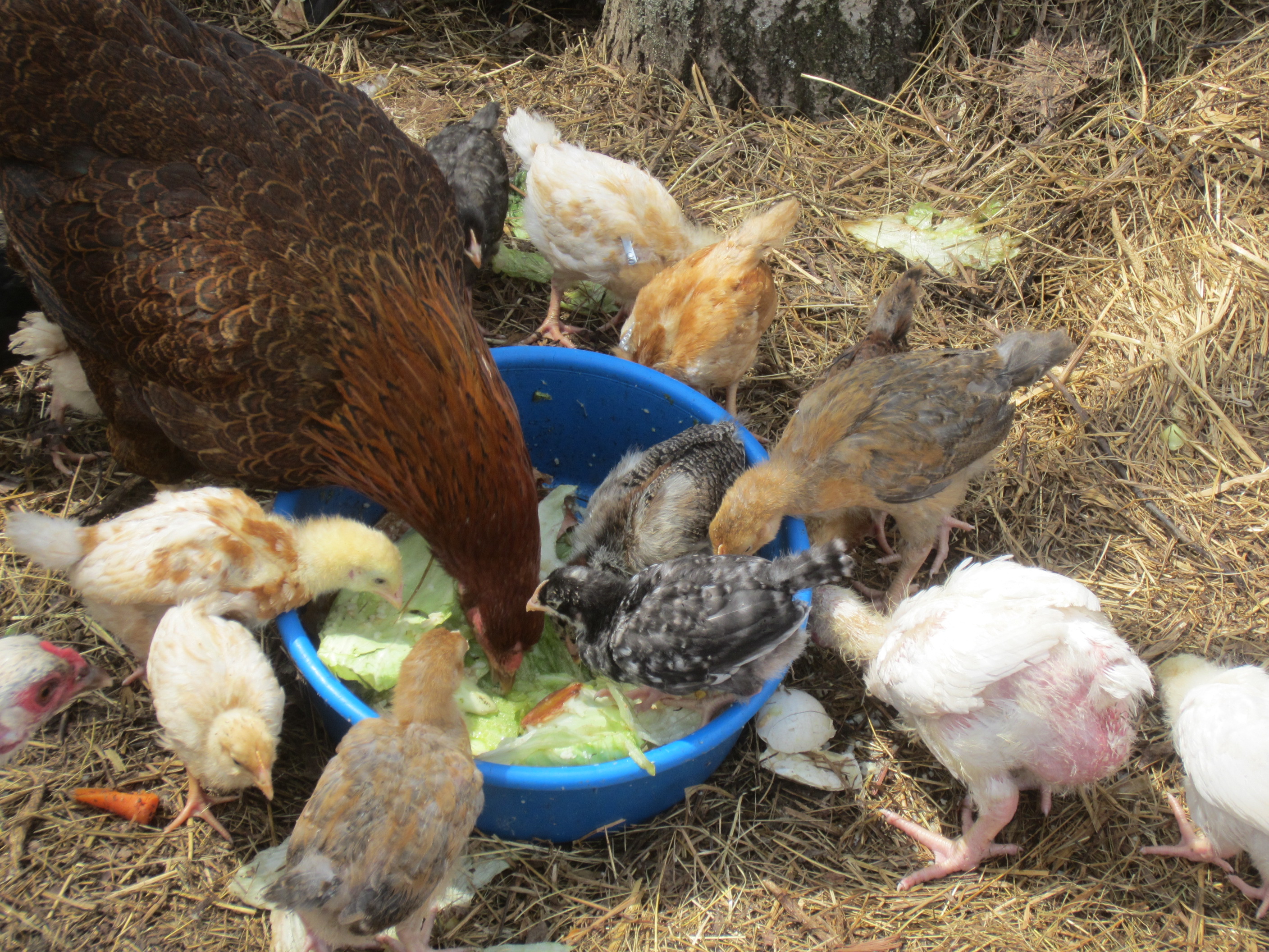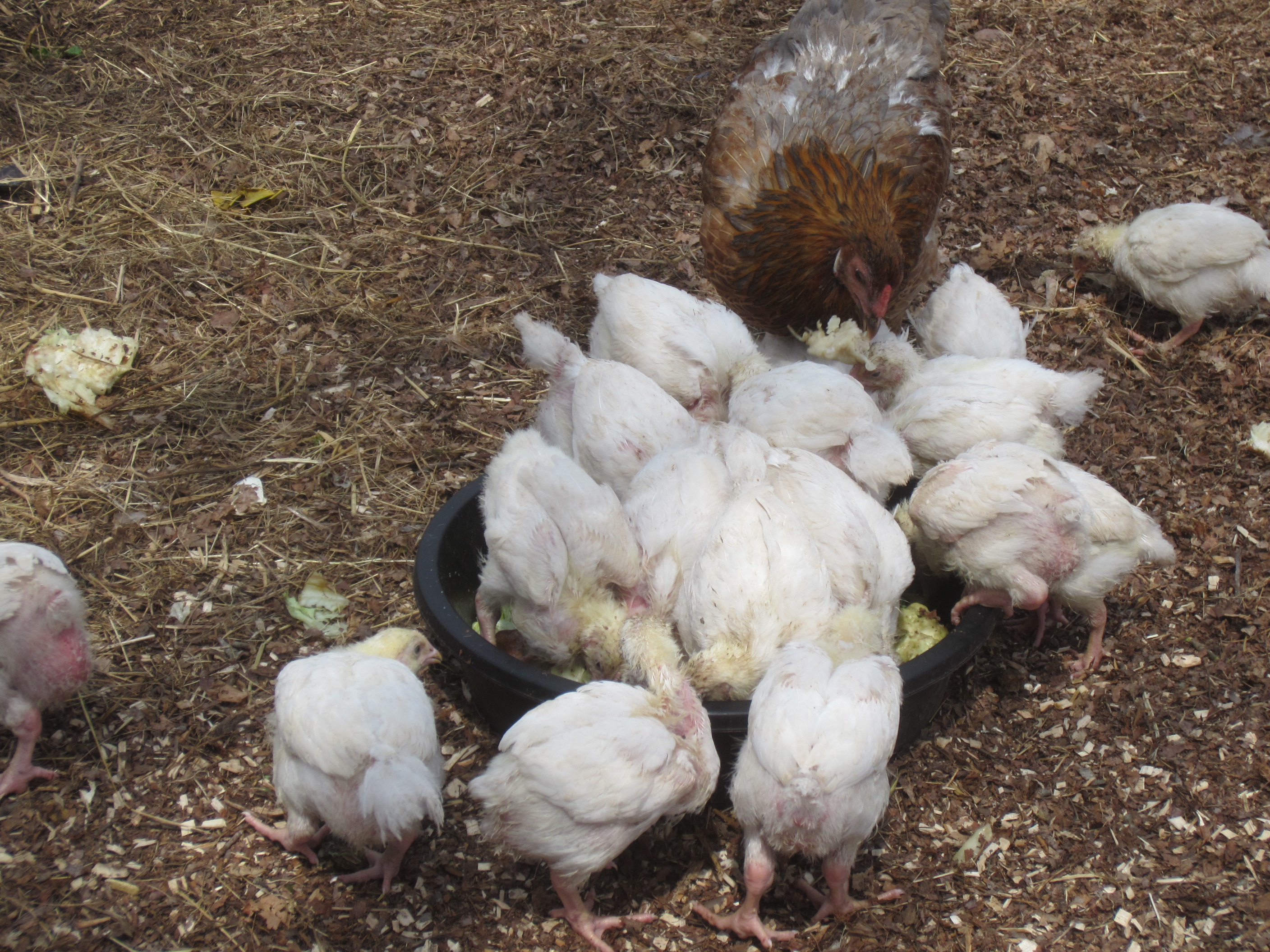 Both Lydia & Olive were also much happier, so I think part of Lydia's "problem" is being bored and cooped up with the chicks. Once she's out and about with them, she seems to calm down. Also, then their efforts of digging holes in the compost was rewarded with earthworms for their broods. Or like in the photo below, the meaties could gorge themselves on food scraps!