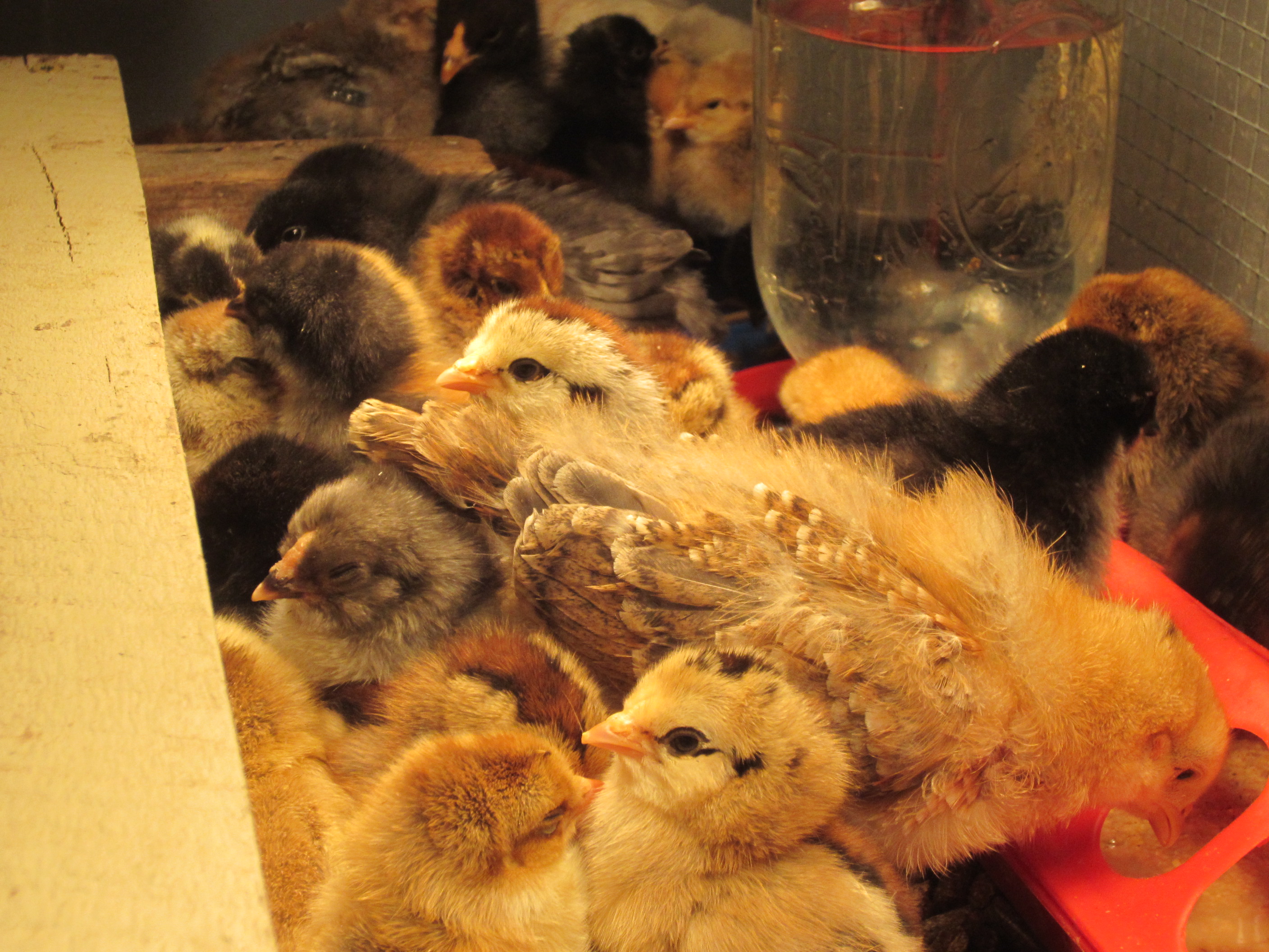 As usual with small chicks, my hands in there caused them to all squawk and run to both ends of the brooder, as they’re afraid of my hands. Then, I cleaned out and refilled their regular chick waterer, as the young’ins haven’t learned yet how to use the nipple waterer. So, instead they fill the other waterer with grass pellets, which expand and make their water dirty, no matter if I clean it out 3x a day!